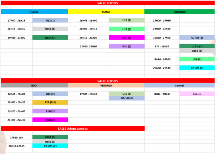 Planning des entraînements